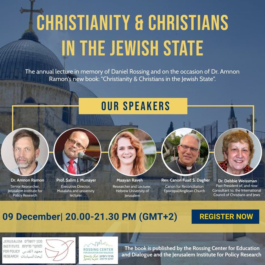 أمسية في ذكرى دانيال روسينج، مؤسس وأول مدير لمركز القدس للعلاقات اليهودية المسيحية. سنذكر الذكرى الحادية عشرة لرحيله في حفل إطلاق كتاب الدكتور أمنون رامون “المسيحيون والمسيحية في دولة اليهود” والذي سيُعقد باللغة الإنجليزية. نُشر الكتاب باللغة الإنجليزية منذ عدة أشهر، وهو نسخة محدثة للكتاب الذي نُشر باللغة العبرية عام 2012.