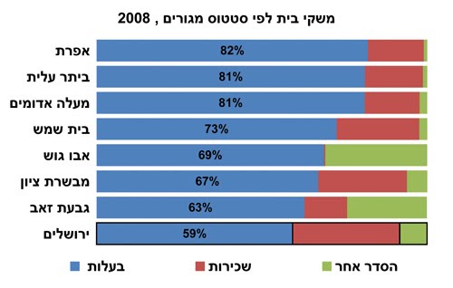 שיעור משקי הבית בישראל שגרים בדירה בבעלותם (66%) גבוה בהשוואה למדינות המפותחות. הסיבות לכך הן תחושת הביטחון שבבעלות על הנכס, עידוד ממשלתי לרכישת דירה, גורמים פסיכולוגים ועוד. שיעור משקי הבית בירושלים שגרים בדירה בבעלותם (59%) נמוך במקצת בהשוואה לישראל (66%). מבין הערים המונות 100,000 תושבים ומעלה, השיעור הגבוה ביותר של משקי בית שגרים בדירה שבבעלותם נרשם בראשון לציון (73%), חולון (71%) ובני ברק (71%). כפי שניתן לראות בגרף, שיעור משקי הבית הגרים בדירה בבעלותם בירושלים, נמוך בהשוואה ליישובים במטרופולין ירושלים.