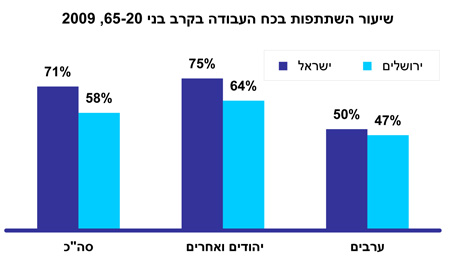 מניתוח של נתוני השתתפות בכֹח העבודה לשנת 2009 בקרב בני 65-20 בירושלים בהשוואה לישראל עולה התמונה הבאה: שיעור ההשתתפות בכֹח העבודה בירושלים (58%) נמוך מזה שבישראל (71%). שיעור ההשתתפות בירושלים הן בקרב היהודים והאחרים (להלן יהודים) והן בקרב הערבים נמוך בהשוואה לישראל. כך נמצא ששיעור ההשתתפות בכֹח העבודה בירושלים בקרב היהודים עמד על 64% בהשוואה ל-75% בישראל, ובקרב הערבים על 47% בירושלים ו-50% בישראל. יוצא איפוא שהפער בשיעור ההשתתפות בכֹח העבודה בין ירושלים לבין ישראל גדול במידה ניכרת בקרב האוכלוסייה היהודית בהשוואה לאוכלוסייה הערבית. הסבר לכך נעוץ בהבדלים במאפייני האוכלוסייה היהודית בירושלים, שכוללת שיעור גבוה של אוכלוסייה חרדית. בקרב האוכלוסייה החרדית בולט שיעור השתתפות נמוך של גברים בכֹח העבודה. מצב זה משפיע הן על תחולת העוני הגבוהה בקרב האוכלוסייה החרדית והן על כלכלת העיר ירושלים. אך הוא גם טומן בחובו פוטנציאל לפיתוח וצמיחה שבכיוונו נעשים מאמצים רבים בעיר ובמדינה – שילוב גברים חרדים במוסדות להשכלה גבוהה על מנת לשלבם בשוק התעסוקה. על השתתפות בכֹח העבודה בקרב האוכלוסייה הערבית ועל הבדלים בין נשים וגברים נרחיב בטור הבא.