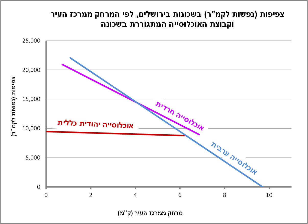קווי המגמה בתרשים המצורף מבטאים את השינוי בצפיפות לפי המרחק ממרכז העיר, עבור כל מגזר. ניתן לראות את הזיקה למרכז העיר עבור החרדים, שמתבטאת בצפיפות, וכן עבור האוכלוסיה הערבית. אולם עבור האוכלוסיה הכללית קו המגמה מקביל לציר האופקי, כלומר שאין זיקה משמעותית למגורים בסמיכות למרכז העיר.