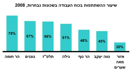 הסתכלות על בסיס שכונתי מעלה כי שיעור ההשתתפות הגבוה ביותר בכוח העבודה היה בהר חומה (79%). שיעורי השתתפות גבוהים היו גם ברמת שרת ורמת דניה (71%), מרכז העיר והנחלאות (69%), גוננים (67%), ותלפיות מזרח (66%). שיעורי השתתפות בינוניים היו בקריית יובל (63%), קריית מנחם ועיר גנים (62%), גילה (61%) ובקעה (58%). שיעור ההשתתפות הנמוך ביותר היה באזור מאה שערים, בית ישראל ושכונת הבוכרים (20%). שיעורי השתתפות נמוכים היו גם באזור סנהדריה ושיכון חב"ד (29%), אזור מקור ברוך, מחנה יהודה וזיכרון משה (33%), רמת שלמה (44%), נווה יעקב (45%), בית וגן (47%) והר-נוף (48%).
