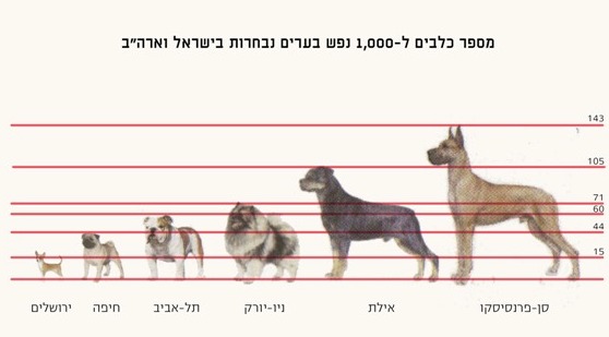 בעיריית ירושלים רשומים 12,300 כלבים, בתל אביב-יפו 25,000 ובחיפה 12,000. בשלוש הערים נרשם רוב של כלבות, אולם בתל אביב-יפו ובחיפה האחוז שלהן גדול יותר (60% לעומת 53% בחיפה ו-52% בירושלים).