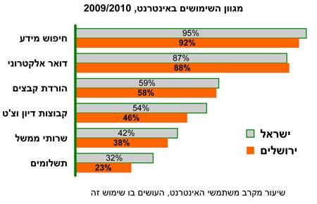 השימושים הנפוצים ביותר באינטרנט בקרב ירושלמים בני 20+, כמו גם בישראל כולה, היו חיפוש מידע ודואר אלקטרוני. 92% ו-88% (בהתאמה) ממשתמשי המחשב הירושלמים הצהירו שהם משתמשים במחשב למטרות אלו. שימושים נוספים היו הורדת קבצים (58%), קבוצות דיון וצ'ט (46%). מפתיע לגלות כי ירושלמים רבים משתמשים במחשב גם לקבלת שרותי ממשל (38%), לקניות (25%), ולתשלומים (23%).