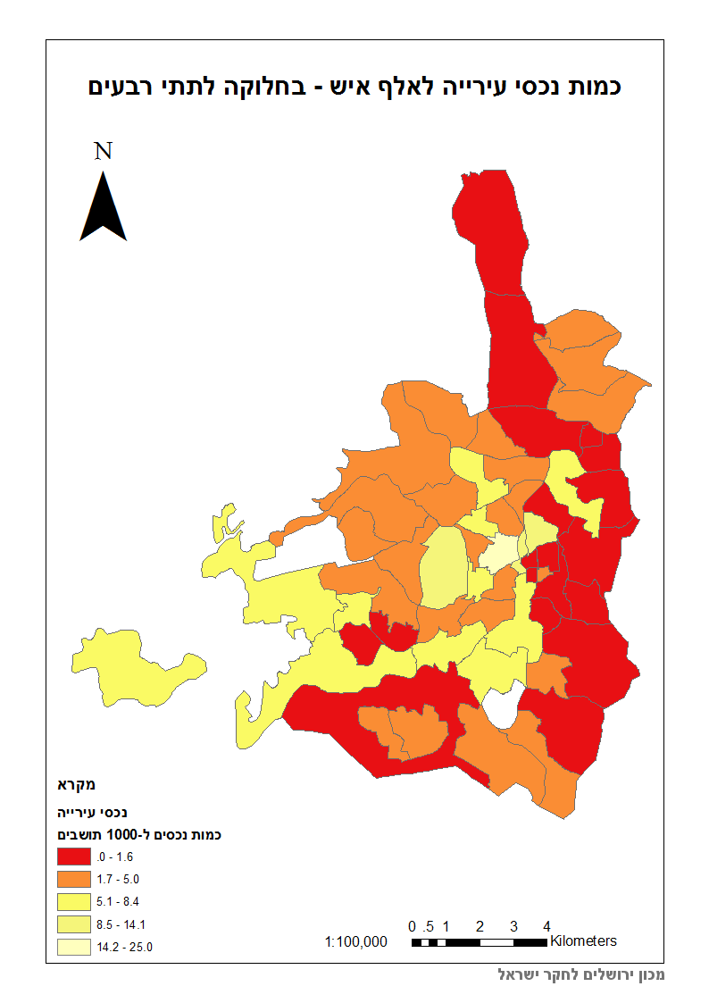 תושבי מזרח ירושלים מהווים 37% מאוכלוסיית העיר, עם זאת רק כ-10% מתוך נכסי העירייה ממוקמים באזור זה. בשכונות חרדיות שאוכלוסייתן מהווה כ-20% מתושבי העיר, ממוקמים כ- 25% מתוך הנכסים שמופו. בשכונות מזרח העיר ישנם פחות משני נכסים לאלף תושבים. בשכונות החרדיות והשכונות הגדולות בהן: גילה, פסגת זאב והר חומה ישנם 2-5 נכסים לאלף תושבים בשכונות דרום העיר המאופיינות באוכלוסייה חילונית בהן: בקעה, קריית יובל, עין כרם ומקור חיים יש 5-8 נכסים לאלף איש. הממוצע העירוני עומד על 3.2 נכסים לאלף איש.