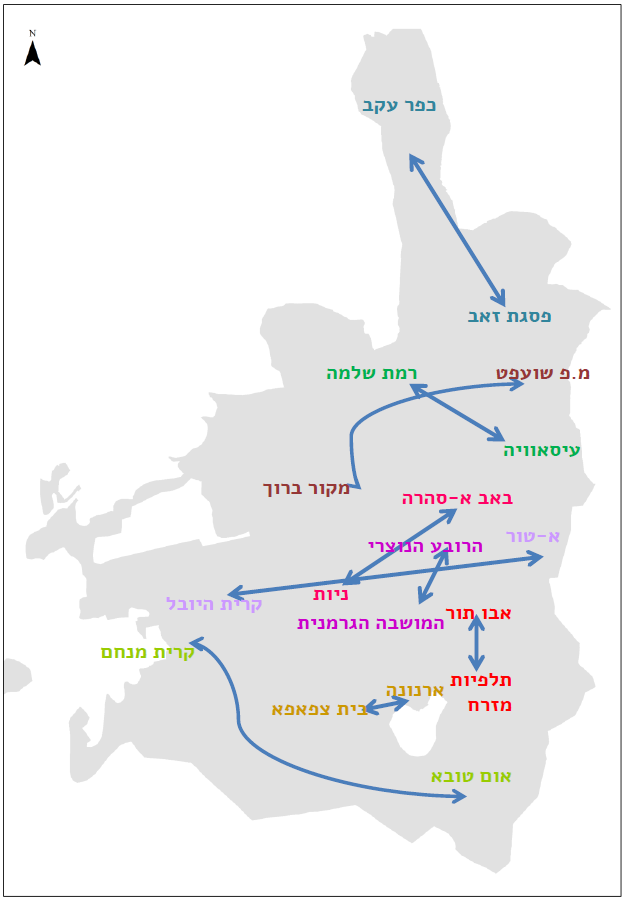 מתוך הקבלת הנתונים עולה גם דמיון גיאוגרפי: לחלק מהשכונות הצפוניות הפלסטיניות היה דירוג מקביל לזה של שכונות צפוניות יהודיות. שועפט ופסגת זאב, דחיאת א-סלאם (ממזרח למחנה הפלטים שועפט) ונווה יעקב ובית חנינא ושכונת רמות. גם בדרום נמצאו שכונות "אחיות": ארנונה ובית צפאפא ואום טובא וקריית מנחם.