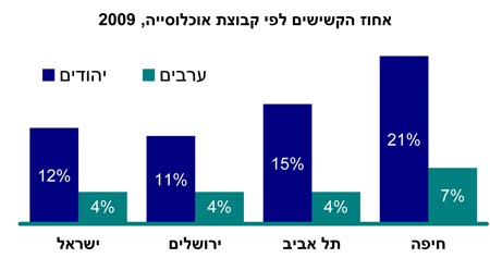 בירושלים מהווים בני 65 ומעלה 8% מהאוכלוסייה, ושיעורם נמוך מזה שבישראל – 10%, ונמוך במידה ניכרת מזה שבחיפה – 18% ובתל אביב – 14%.