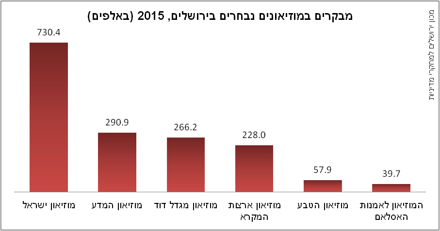 לא בכדי מוזיאון ישראל, המוזיאון הלאומי, הוא המוזיאון הפופולארי בירושלים. במוזיאון ישראל הוצגו, נכון לשנת 2015, מעל ל-290 אלף פריטי אוספים ב-34 תערוכות שונות. וביקרו בו כ-730 אלף אנשים. מוזיאונים נוספים אשר מושכים מבקרים בירושלים הם מוזיאון המדע ע"ש בלומפילד אותו פקדו בשנת 2015 כ-291 אלף מבקרים, מוזיאון מגדל דוד, אליו הגיעו בשנה זו כ-266 אלף מבקרים, ומוזיאון ארצות המקרא עם 228 אלף מבקרים. נכון לשנת 2013, כ-37% מהמבקרים במוזיאונים המוכרים בישראל עשו זאת במוזיאון בעיר ירושלים. מדובר ביותר מ-1.63 מיליון מבקרים אשר פקדו את המוזיאונים בעיר, לעומת כ- 1.07 מיליון מבקרים במוזיאונים בגוש-דן ( 24% מכלל המבקרים במוזיאונים בישראל), ו-530 אלף מבקרים במוזיאונים שבחיפה וסביבותיה (12% מכלל המבקרים).