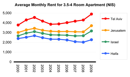 The upsurge in the 2009 rental market was felt throughout Israel, without exception. Still, Jerusalem saw the largest increase, which reached between 17-21% in 2009 alone, depending on apartment size. The average increase in Israel as a whole ranged between 15-18%, and the increase in Tel Aviv was 14-18%. Haifa saw a more modest price hike of 10-13% on average. These low, two-digit percentage price hikes translate into hundreds of sheqels. For example, a 3.5-4 room apartment in Jerusalem, which averaged a rent cost of 3,100 NIS in 2008, cost 3,700 NIS per month by 2009.
