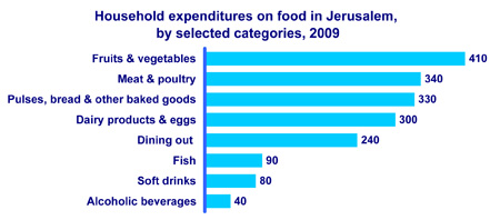 Monetarily, the household expenditure on food in Jerusalem, Israel and Tel Aviv was similar, around 2,100 NIS.  But as we know, ‘different strokes for different folks’.  In Jerusalem, the primary food expenditure categories were fresh produce (410 NIS), meat and poultry (340 NIS), bread, grains and other dough products (330 NIS), milk products and eggs (300 NIS) and dining out (240 NIS).