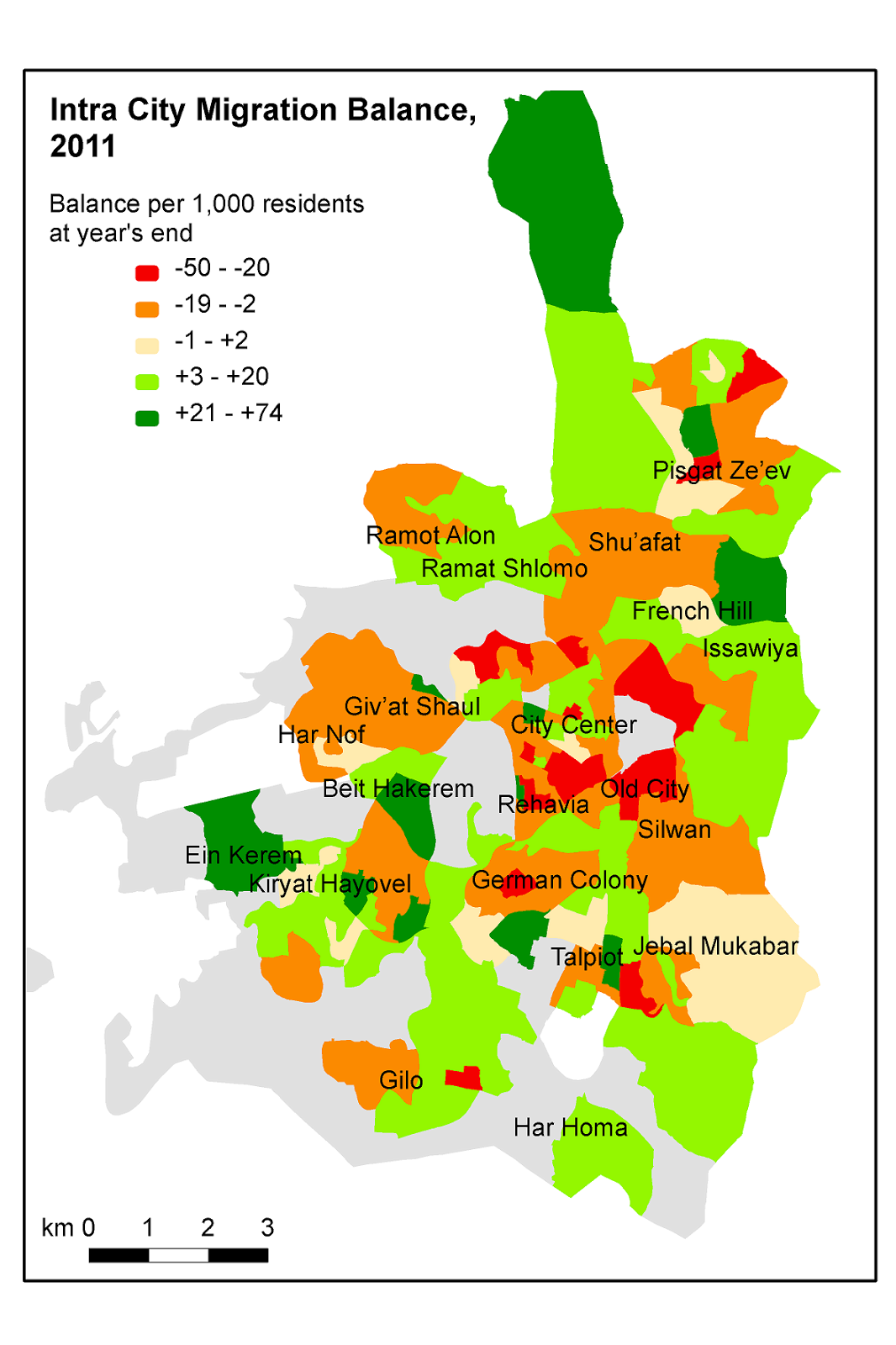 On the occasion of Jerusalem Day, celebrated this week, we look at figures from the new Statistical Yearbook of Jerusalem, published annually by the institute. The figures of intra-city migration, or migration from place to place within Jerusalem, are often good indicators for the appeal of neighborhoods to incoming Jerusalemite migrants, and also indicate which neighborhoods are experiencing negative in-city migration.