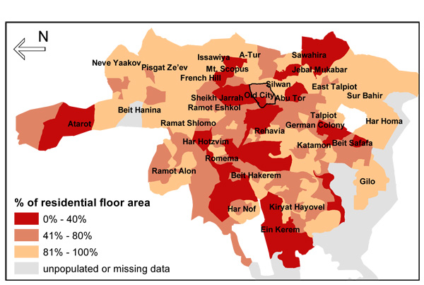The third group (40%-59%) comprises residential areas with major commercial and business centers, such as the southern part of the French Hill neighborhood, parts of the Old City, and parts of BayitVagan. The fourth group (10%-39%) covers those areas where residential use is not the principal characteristic of the area, such as parts of the city center and parts of Giv’atShaul. The fifth group (0%-9%) comprises Jerusalem’s main commercial and business areas, such as HarHotzvim, the government compound, and the Malkha shopping mall.