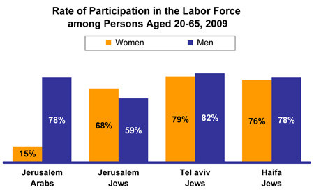 Women’s labor force participation rates were lower in Jerusalem than in Israel , among both the Jewish and Arab populations. In 2009, the labor force participation rate for Jewish women was 68% in Jerusalem compared with 75% nationally; for Arab women the rate was 15% in Jerusalem compared with 26%.