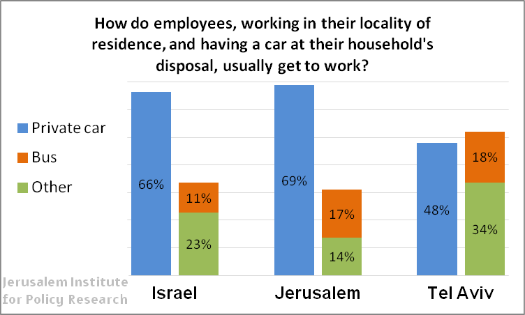 What’s the situation in Jerusalem? The survey found that 69% of Jerusalemites who own cars and who work in Jerusalem drive to work. This leaves 31% who get to work in other ways, which is a little lower than the national average. Might this be because the city is so large or maybe because public transportation does not meet the needs of residents in all neighborhoods?