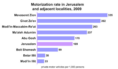 The motorization rate in Jerusalem in 2009 measured 169 private motor vehicles per 1,000 persons, which was one of the lowest rates among the country’s cities. For the sake of comparison, the motorization rates in Be’er Sheva measured 198 vehicles per 1,000 persons. In Rishon LeZion this figure stood at 295, and for Haifa it was 321. The motorization rate in Tel Aviv was among the highest in the country, measuring 469 private motor vehicles for every 1,000 persons. As the graph shows, Jerusalem’s motorization rate is relatively low in comparison with its adjacent localities, excluding Beit Shemesh and the Haredi localities.