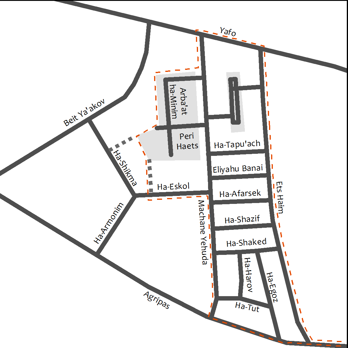 The boundaries of the market are not clearly delineated, but we defined them for the sake of this assessment as covering the streets between Jaffa Road to the north and Agripas to the south, Ets-Haim (the roofed part of the market) to the east, and the Iraqi market and Mahane Yehuda Street to the west. In all we examined a total of 370 businesses situated within an area of 19 dunams (1 dunam is approximately ¼ acre). By way of comparison, the Malha Mall has nearly 230 stores spread out over some 20 dunams in a building with two and a half floors of commercial space.