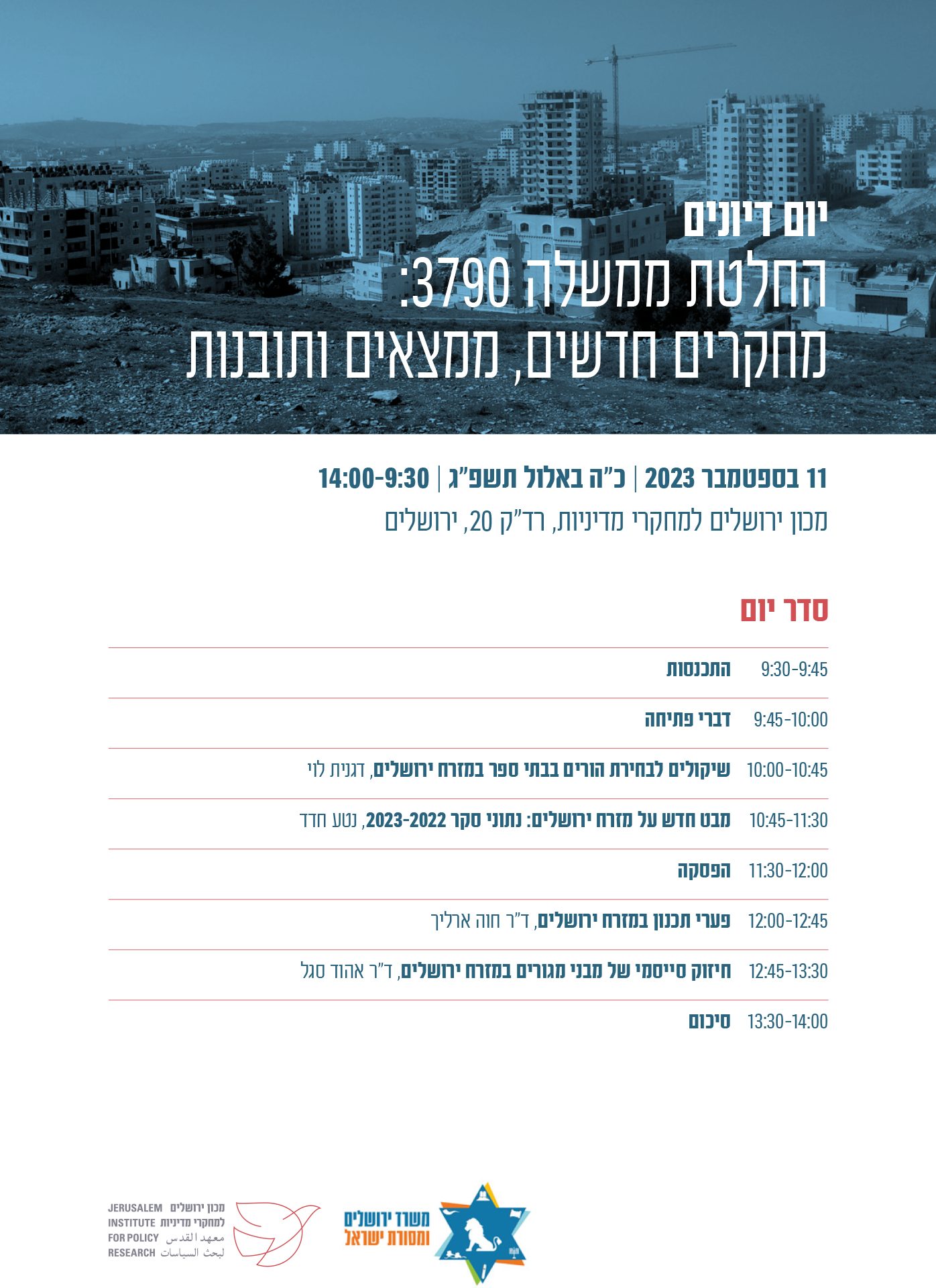 ביום 11.09.23 התקיים יום הדיונים השנתי בסדרת ימי הדיונים לליווי מחקרי החלטת ממשלה 3790 (צמצום פערים חברתיים כלכליים ופיתוח כלכלי במזרח ירושלים). יום הדיונים נערך בשיתוף משרד ירושלים ומסורת ישראל ובמסגרתו הוצגו ארבעה מחקרים שהתקיימו במהלך שנת 2023 – השנה האחרונה לתכנית חומש זו. ביום הדיונים נכחו קובעי מדיניות ממשרדי הממשלה השונים (משרד ירושלים ומסורת ישראל, משרד האוצר, משרד המשפטים, משרד החינוך, משרד הפנים ועוד), מעיריית ירושלים ומגופים עירוניים, ביטחוניים ומקצועיים נוספים וכן נציגי פילנתרופיה מקרנות שונות.